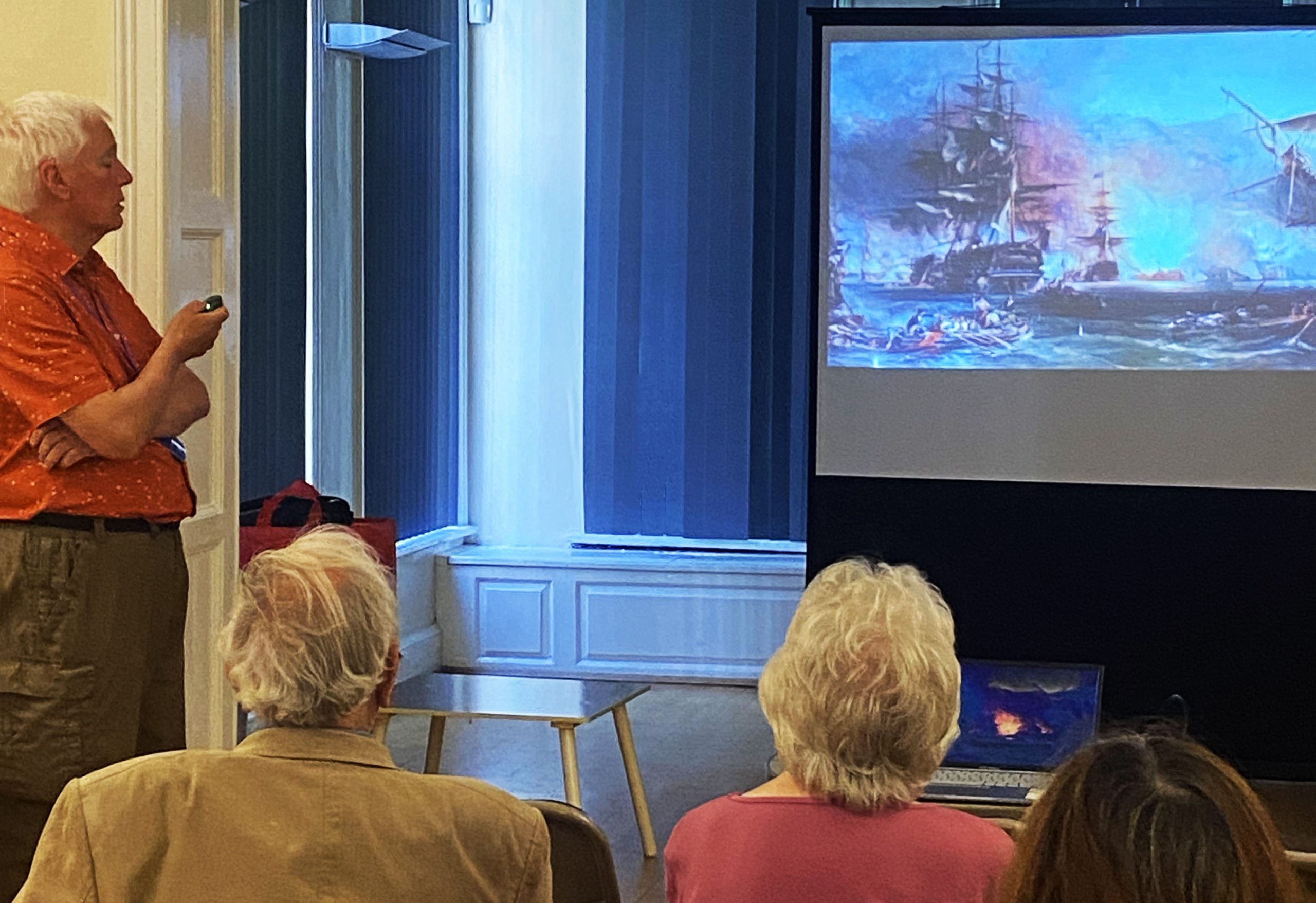 Probably the most interesting of the slides was that of the painting by George Chambers (see below) depicting the battle in progress, which showed not only the main ships in action but also depicted a small boat crewed by an officer and 10 men, mounted with a canon, that was tasked to get near to the Algerian ships and cause as much damage as possible; although it probably wasn’t depicting Edward himself, Edward was tasked with commanding one of the small boats and was wounded during the action.